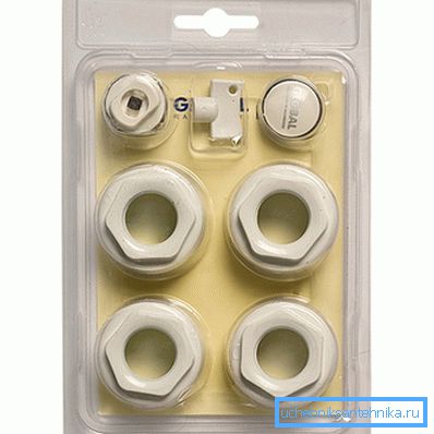 The fittings necessary for the installation of heating devices are self-realized in the form of special or universal kits. The kit contains two plug-in plugs designed for supply and return connections, and two plugs designed for the tight closure of the two remaining openings. If more openings are acquired, not two, but four plugs.