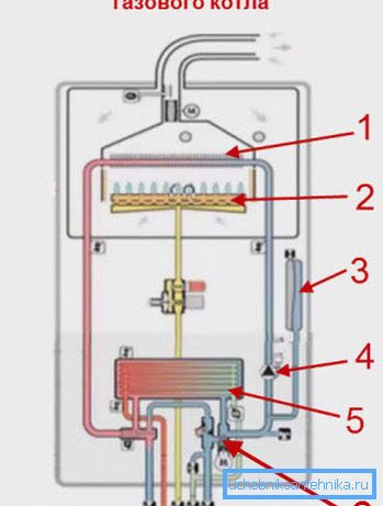 - The coolant enters the heat exchanger (1), where it is heated by the gas burner (2) and sent to the heating system under the action of the circulation pump (4), thus performing a circular motion in a closed heating circuit;