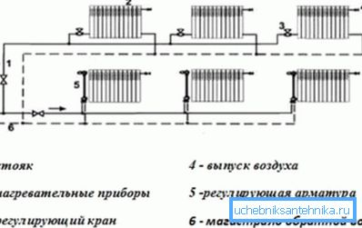 - Vertical two-pipe heating system when the batteries are connected to a vertical riser. Apply it in multi-storey buildings, giving the opportunity to attach to it each floor separately. The main advantage of the design is the absence of air plugs when using it. The price of arrangement will be higher than other options.
