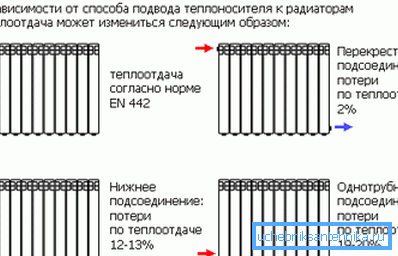 - the lower one-way connection is the most disadvantageous in terms of the heat transfer of the battery. Losses can be up to 20%, but pipes can be hidden under the floor, so this method of connection is also often used.