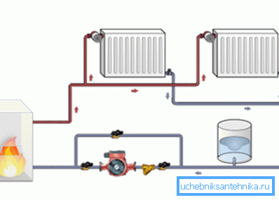 - Forced - circulation is carried out using a circulation pump. In this case, the booster tank is not needed, however, an expansion tank is needed to compensate for the thermal expansion of the coolant.