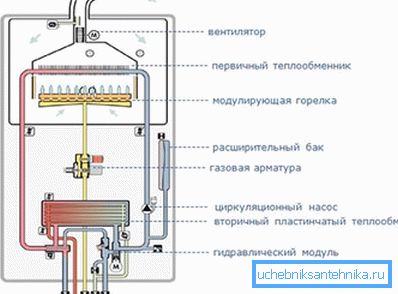 - Dual-circuit heaters, which in addition to increasing the temperature of the coolant entering the heating system, heat water used for domestic purposes. For this purpose, there are two coils in the combustion chamber, and in some cases, a storage tank, which contains a supply of already heated water.