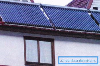 Placed solar heat exchangers. The best place for them is on the south wall of the house or the roof. In the latter case, it is desirable to install the panels at an angle of 30-45 degrees to the horizon. In this case, solar heating systems will work more efficiently.