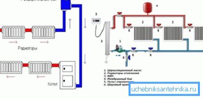 Note! For a small room it is more profitable to use a two-pipe scheme, since it is cheaper and simpler, but for a large house with many rooms, collector wiring would be preferable. There are variants of combined schemes, where two pipes go to the radiators, and the collector distributes water in the contours of the heated floor.