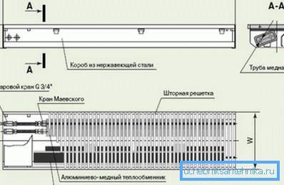 Connection to the riser or the central pipeline is carried out through special inlets with a thread inside, which are located at the end of the device or at the side. On modern heating water convectors taps-valves or manual / automatic valves are installed to release excess air, which impairs heat transfer.