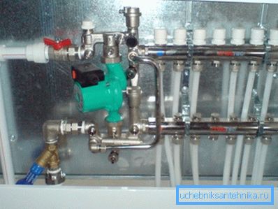 | Circulation pump | It is used to organize the coolant current over all elements of the climate system. If the warm floor is mounted together with radiators, it is advisable to provide for the installation of a pump on each circuit. So you can more finely regulate the microclimate. Sometimes the pump is built into the boiler, so you do not need to buy it separately. |
