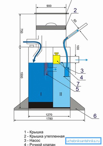 Inside is a shelf for the installation of a drainage pump for pumping drains if necessary. There are inlet and outlet pipes. They are already installed and sealed. If desired, you can install an additional inlet pipe through which liquid without solids will flow directly into the second chamber. In the multi-chamber version, a biofilter is installed in the first section, intended for bioprocessing and filtration of solid fractions.