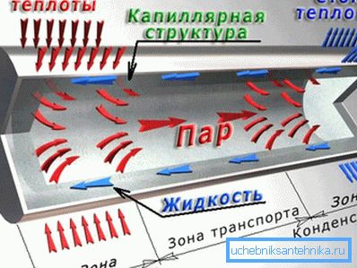 The principle of operation of heat pipes is that energy transfer occurs due to evaporation and further condensation of the liquid. To understand how this happens in practice, it is necessary to imagine a closed container made of a metal with good thermal conductivity and filled with some water.