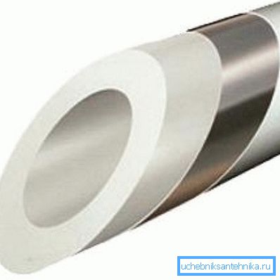 - The pipes are reinforced with fiberglass or aluminum foil - this layer is placed in the middle, as shown in the schematic figure above. Such a measure prevents deformation of the material during heating, therefore, similar products are also used for heating. Despite the fact that the price of reinforced pipes is higher, they are used for cold water supply with the purpose of reinsurance - in most cases the system is made of a hidden type, closing it with plaster, putty, drywall and so on.