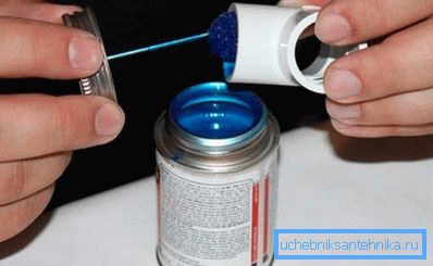 Glue for plastic PVC water pipes is applied to the inner surface of the socket. Then the second pipe is inserted and turned into it to evenly distribute the adhesive, after which the joint remains stationary for several minutes.