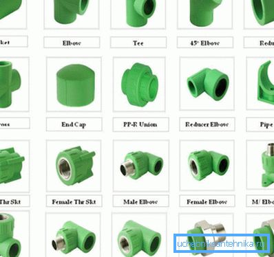 For docking, turning or moving to another plane of the polypropylene pipe when installing it in the house, in the country or in the apartment with their own hands, special PPR threaded, solder and combined fittings are used. These devices also allow you to make decoupling with pipes of different diameters, for example, when switching from a thicker riser to horizontal wiring.