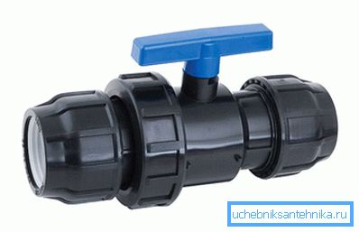 Such a fitting, combined with a ball valve, can be used after insertion into the trunk. Typically, such a transition is installed in the manhole, and after the pipeline is sent to the house.