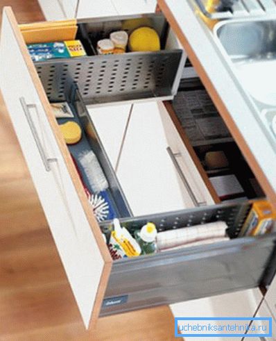 - Now the choice is much wider, in addition to the usual compartments with doors, mounted sectors with rows of self-retractable drawers. Various filters, household waste shredders and, of course, waste bins are installed here. At the same time, the classic garbage can gradually fades into the background, giving way to multi-compartment boxes for different types of waste.