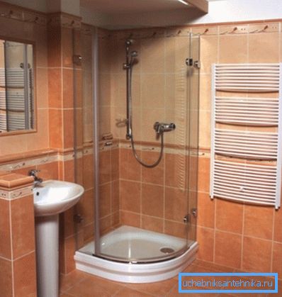 To isolate the shower space can be used glass walls of the cabin or water-repellent curtains, mounted on metal or plastic rails.