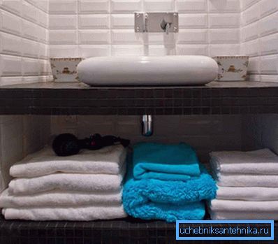Tip! Professionals recommend creating shelves or drawer cabinets under the sink. This will allow you to efficiently use the free space and hide some objects or things from sharing.
