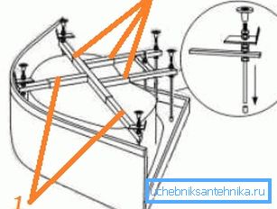 First, on the pallet turned upside down, the crosspiece is attached, and then the legs, which are presented in the form of studs with locknuts and heel-nuts on the ends. The threaded surface allows you to adjust the legs to the level, therefore, you need to use it during installation.