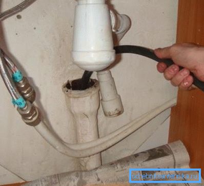 Tip: sometimes the traditional siphon in the bathroom is replaced with a curved rigid pipe with a water gate. In this case, it is better to put the cable directly from the bathroom, and the effect and quality of cleaning will increase many times if you simultaneously open hot water.