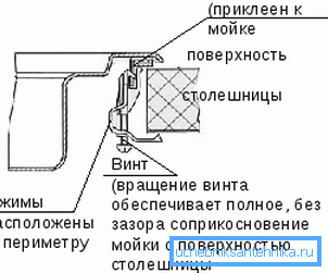 - The parts are interconnected with a screw, twisting which we can adjust the distance between them. If the lower part is fixed at the sink and the upper part rests on the tabletop, then reducing the distance we will press the sink to the table;