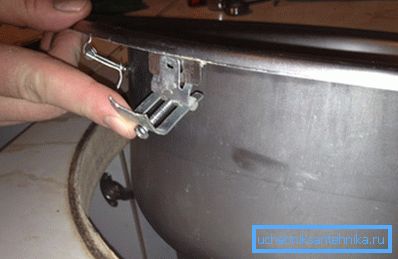- Parts have a hinge, and the upper part can be bent relative to the bottom. During installation, this feature allows you to first bend the teeth inward, insert the sink into the hole in the tabletop, and then again bend them back and rest against the board.