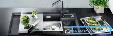 Not less in demand are models in the shape of a rhombus, polygon or a complex oval, which combine two bowls and platforms for cutting semi-finished products and drying dishes. In general, multifunctionality is the distinctive feature of all modern plumbing, and complete with a sink are often attached all kinds of baskets, grates, drawers and other auxiliary devices.
