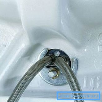 - We take the mixer, we wind on it flexible hoses of the eyeliner, we pass them into the hole in the bowl together with the screw for fixing. From the back side we put on the fastening bracket on the screw and twist the nut;