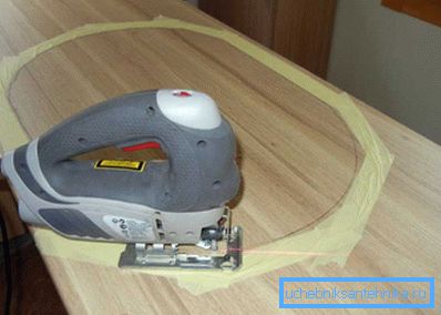 In cases where the tie-in to the tabletop of the cabinet is made for surface mounting, you can use an electric jigsaw - the sides of the sink overlap the cut perimeter. However, in order not to scratch the surface, the perimeter of the hole is covered with masking tape, as shown in the photo.