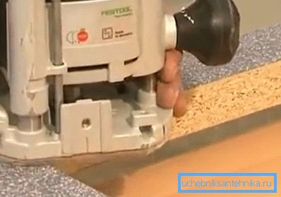 - First of all, it should be noted that branded sinks with cabinets, where an inset with an embedded installation is provided, are completed with a rigid template, according to which you will need to cut a hole in three (even in four) steps - one pass from the top and three - from the bottom. To do this, a milling cutter with an end cap is used, and the first groove is selected from the top (front) side, but you need to cut this hole completely to remove the cut center.