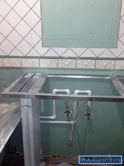 After the main part of the structure is completed, an internal niche is formed. At this stage it is necessary to determine the location of the supply hoses. So that they do not spoil the appearance of the structure, they can be hidden behind the gypsum board panel.