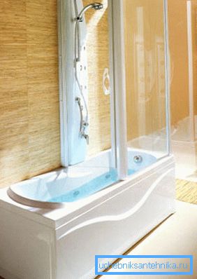 - Full tightness. Everything that happens in such a design in it remains. Steam, spray, foam will not be on the floor, walls and even the ceiling of the room, which guarantees the safety of the decorative finish from the detrimental effect of excessive moisture.