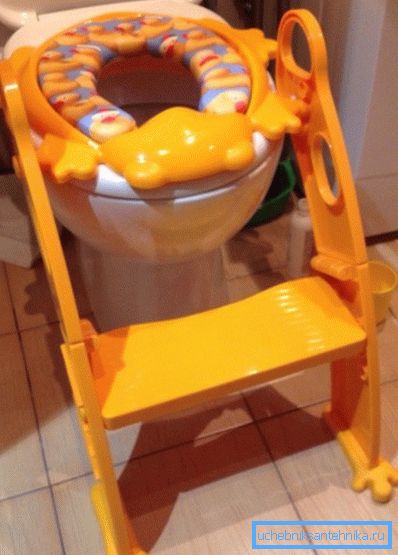 - Attached supports represent the whole designs: a framework for a toilet bowl with a seat and a step in order that it was even more convenient to the child to use a toilet. The small weight of the system allows even a child to move it, a step makes it easier to sit, and the handrails on the sides eliminate falling. It is best to choose options with the possibility of adjusting the height of the steps, so you build it under your child.