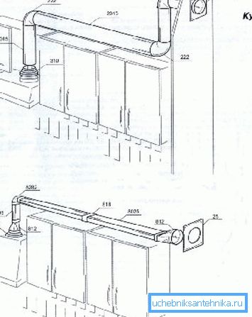 - Embedded design may be a special case of the suspended version. Both the unit itself and the outlet pipes are completely hidden in the hanging furniture and do not spoil the general interior of the room. It is not often encountered, since commercial models of wall cabinets are usually less than the reach of the hood.