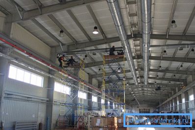 Ventilation ducts in industrial premises are usually attached to the ceiling. After that, they can be masked by hanging decorative panels. In commercial premises, it is advisable to use air ducts made of plastic or copper, which have a more attractive appearance.