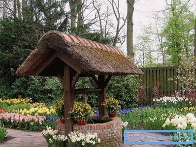 The roof of the well, its base and the whole area around it can act as a flower bed. Bright and colorful flowers with a heady aroma can be placed in hanging pots or placed directly on the sides.