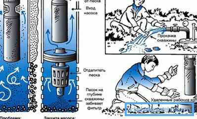 After all the preparatory work, turn on the pump and begin to carry out a slight rocking motion up and down, the pump should always be at the bottom of the well. When rocking, the screwed arm stirs up the mud, and the pump pumps the water with the contaminants upward. Periodically, you need to pull out the pump and inspect the inlets. If they are clogged, they need to be cleaned; you must also make sure that the pump does not overheat.