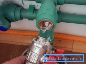 - Then we install a crane to the pipe inlet, preferably a ball valve, and fasten a collector to it. This detail is needed in order to equip several independent water supply circuits: so when using one mixer, the pressure in the others will not decrease to critical values.