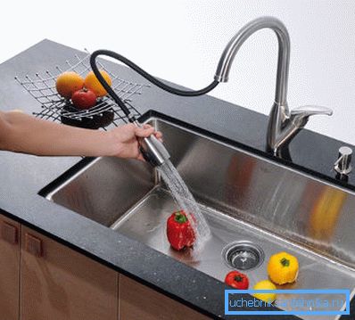 - A shower with a tap will also be a useful acquisition.. It can be installed both parallel to the main spout (in this case the retractable hose is hidden under the sink), and as a separate kitchen appliance. The use of such systems greatly facilitates the washing of dishes, since the hose allows you to direct the water jet at the right angle.