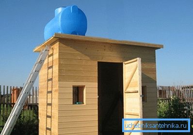- Next is the tank at the top of the building.. It is best to use flat variants of shower tanks specifically designed for this purpose, but you can adapt tanks of almost any configuration. The main thing is to securely fix the system, before that do not forget to fix the watering can, after that it will be very difficult.