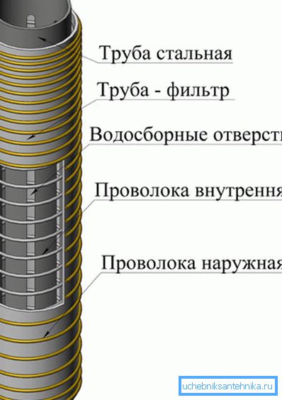 - Operation of a well in water is impossible without a good filter column. It is located in the lower part of the barrel and is a through pipe with perforations and a mesh for mechanical filtration of water.