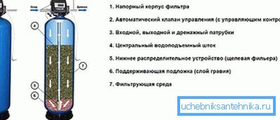 Cleaning scheme: aerator, filter and tank for collecting clean water. From the well, water is supplied to the aerator for oxidizing iron, after that - a quick filter, where cleaning goes from top to bottom and in the opposite direction.