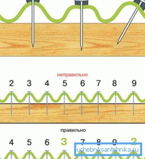 - Fastening is carried out in each crate around the edge. At the bottom of the nails driven through a wave. In the central part it is possible to fix the coating through one crate.