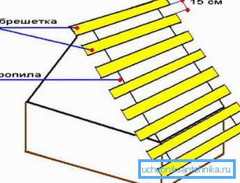 - Fixing truss legs can be achieved by crates from edged boards. For the Euro-slate, the distance between the elements is from 10 to 15 cm. When fastening, it is necessary to release the strips 100 mm in order to provide an overhang for binding from the gable side.